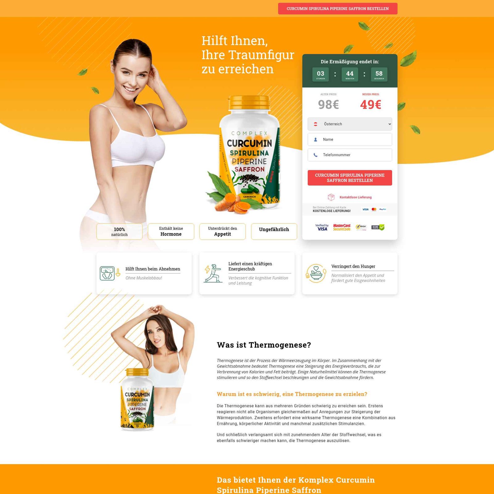 Curcumin Spirulina Piperine Saffron-Kapseln enthalten alle Wirkstoffe, die notwendig sind, um die Thermogenese zu stimulieren und die Ergebnisse der Gewichtsabnahme zu maximieren.